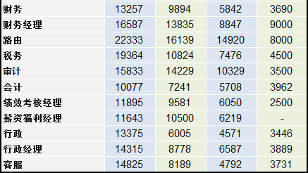 在職能類職位中,會計的薪水較低,5年以上工作經(jīng)驗月薪只有1萬左右。薪水最高的當(dāng)然是稅負(fù)、IT支持及法務(wù)。