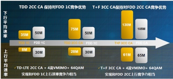 TDD/FDD融合組網對于中國移動有著多重的重要性:其一,只有TDD/FDD融合組網后結合載波聚合功能實現130M下行/60M上行才能確保在速率上時時都能領先FDD一步(如圖所示);其二,只有TDD/FDD融合組網才能幫助中國移動擺脫其國際合作伙伴的FDD LTE用戶漫游到中國移動網絡上無4G可用的尷尬境地;其三,隨著移動寬帶步入物聯網時代,當寬帶由人的連接發展到“人+物”的連接,TDD(時分雙工)技術適應非對稱業務的優勢會由于上行受限而變成劣勢,所以TDD/FDD融合組網是必然趨勢。