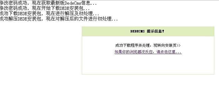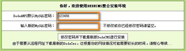 在輸入新的MySQL密碼框中輸入你需要設(shè)置的MySQL密碼點(diǎn)擊“修改密碼并下載最新版DedeCMS運(yùn)行安裝”執(zhí)行修改MySQL密碼下載最新的DedeCMS安裝程序。等待程序下載,會(huì)花幾分鐘的時(shí)間 如圖五: