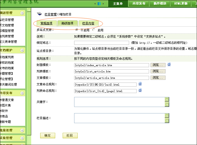 5、欄目模板、欄目生成的HTML和欄目文檔的HTML的命名規則都是可以手工指定的,可以在高級參數中填寫這個選項。