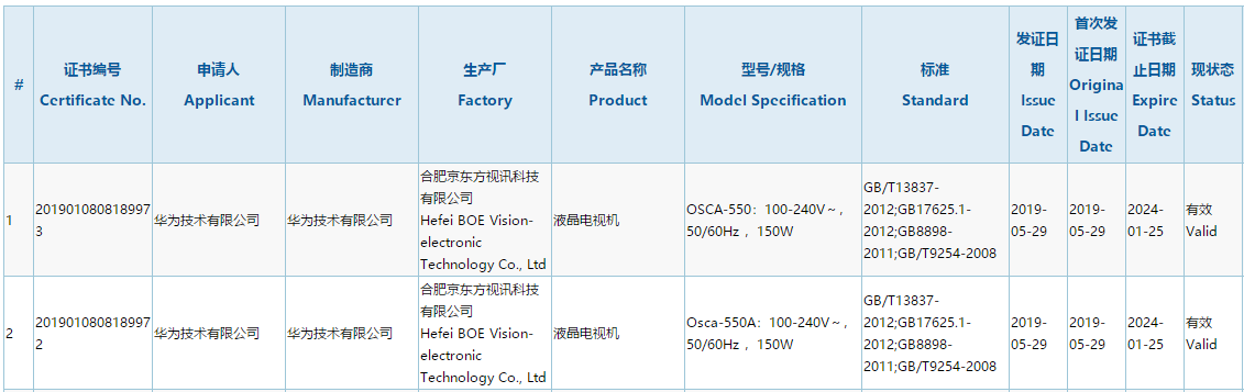 5月30日,中國質量認證中心網站顯示,華為兩款液晶電視機通過3C認證,生產廠商為合肥京東方視訊科技有限公司。