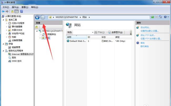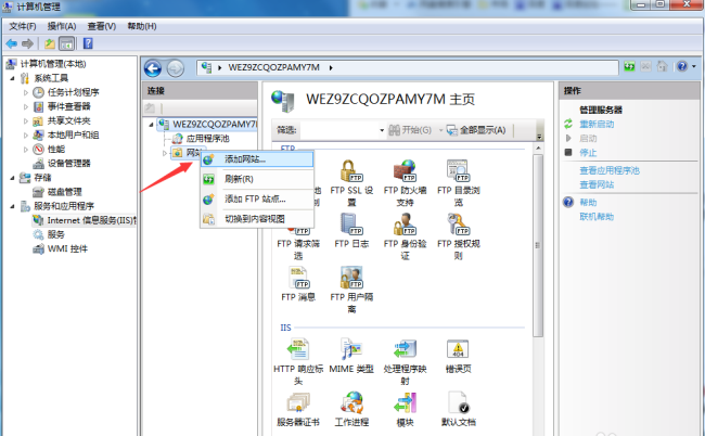 7、添加完成 IIS服務之后,開始創建我們的FTP站點,右鍵點擊我的電腦選擇管理,然后找到服務和應用程序選項點擊打開,接著點擊Internet信息服務管理。此時我們可以看到右邊出現了一個連接框。