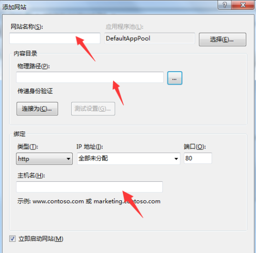 9、然后在彈出的添加網站框里面輸入我們的網站名稱,物理路徑也就是我們的FTP本地文件夾,我們可以在磁盤里面新建好,然后選擇添加,IP地址選擇我們本機的IP地址。