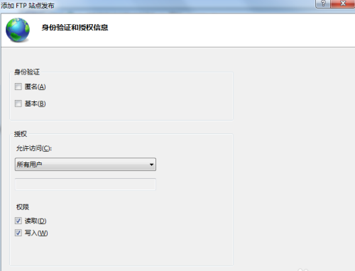 11、然后進入身份驗證設置選項,我們根據個人用途選擇身份驗證的基本要求,以及用戶的相關權限,設置完畢點擊完成選項。此時會提醒我們FTP站點發布成功。