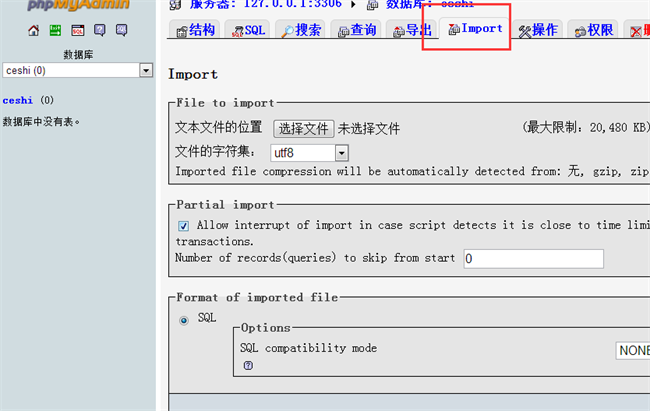 第二步,點擊進入ceshi數(shù)據(jù)庫,點擊“import”按鈕,進入數(shù)據(jù)導(dǎo)入界面;